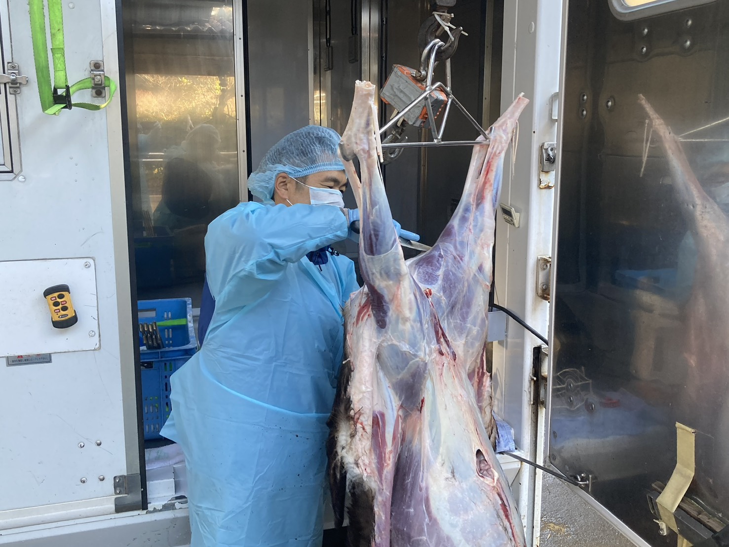 真庭市内の猟師さんによって捕獲された鹿は真庭市が運用する移動解体施設車「真庭市ジビエカー」に持ち込まれ、皮剥や内臓の摘出などの解体業務(一次処理)を行い枝肉の状態にします。私はその一次処理業務にて活動してます。そしてその枝肉は精肉店に販売され、精肉加工をされて市場に並びます。