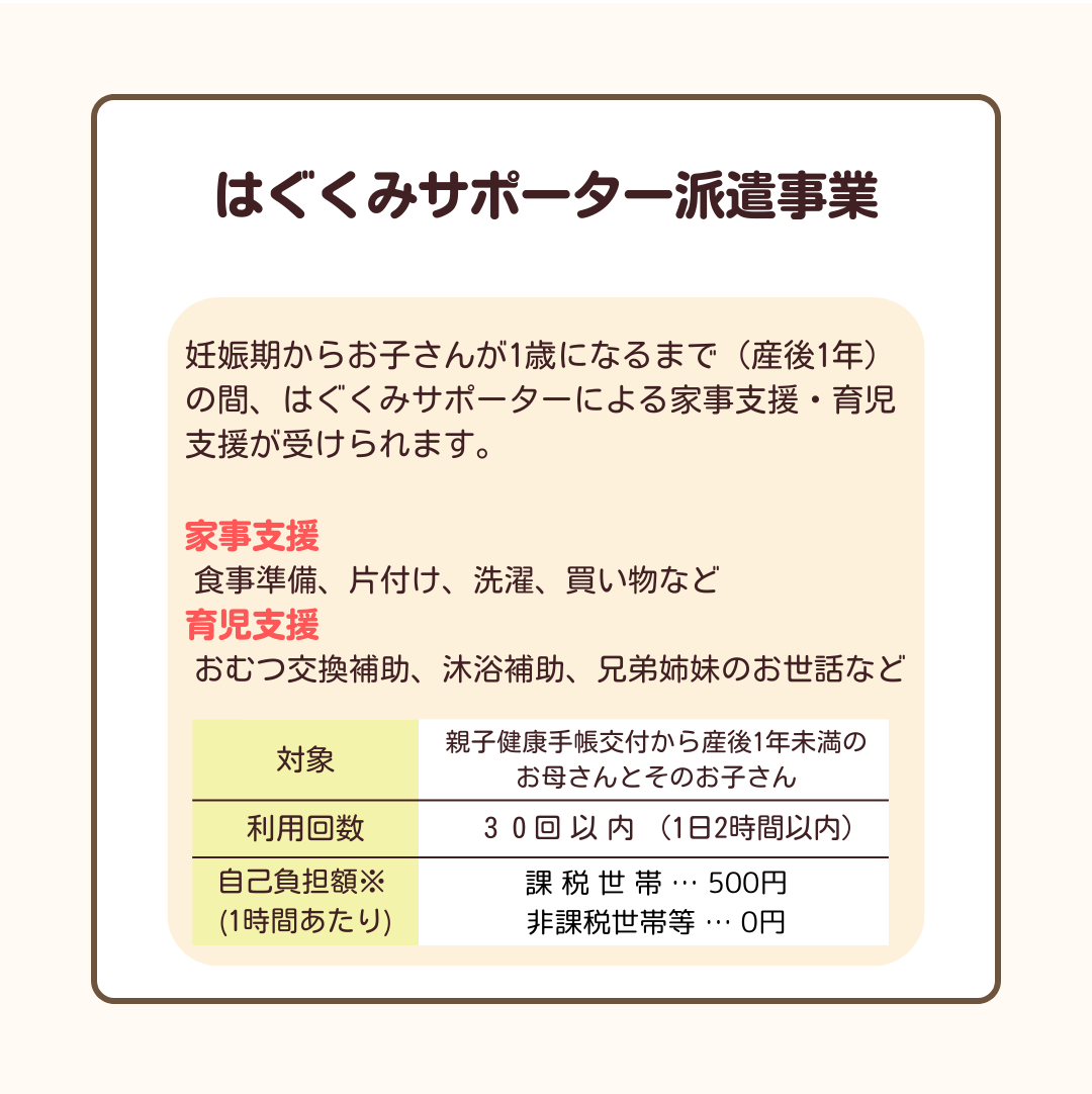 妊娠期からお子さんが1歳になるまで(産後1年)の間、はぐくみサポーターによる家事支援・育児支援が受けられます。