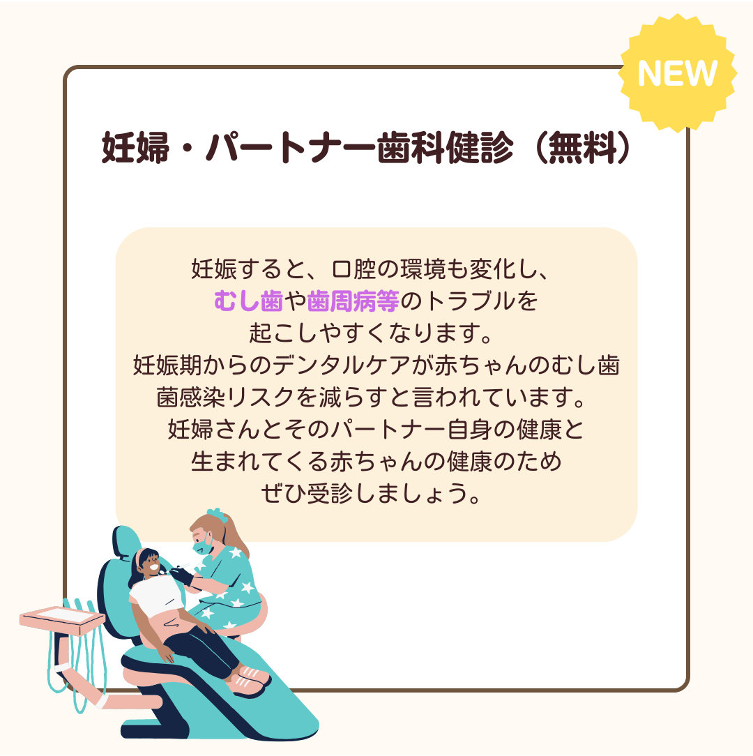 妊婦さんとそのパートナーは、歯科検診を無料で受けられます。