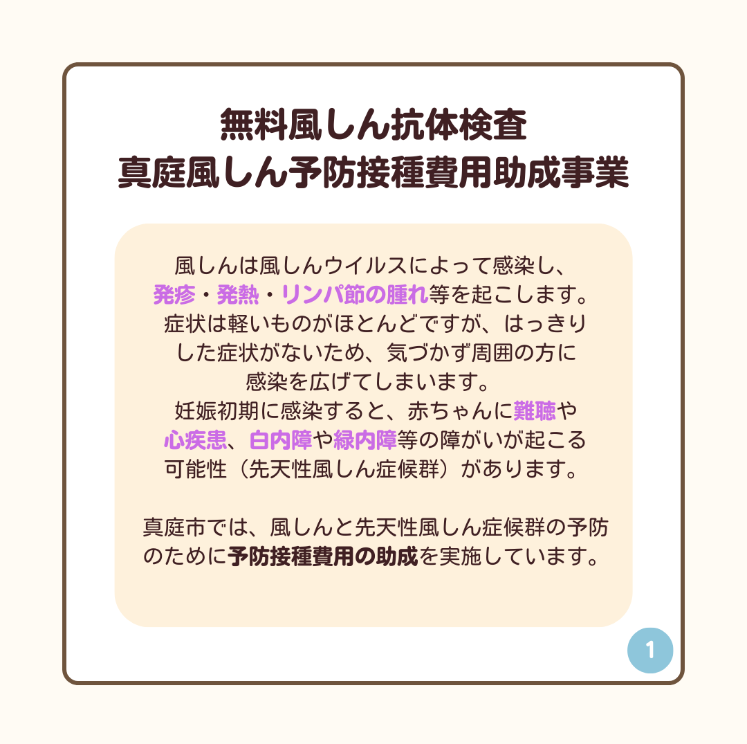 風しんと先天性風疹症候群の予防のために予防接種費用の助成を実施しています。